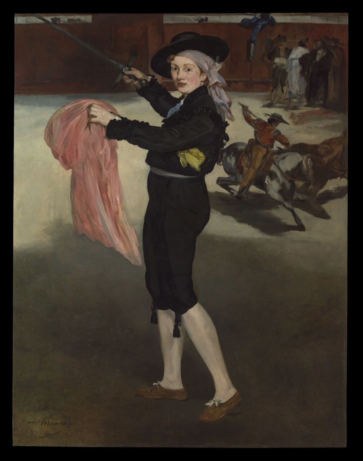 In 1862, Édouard Manet painted his model and muse Victorine Meurent in drag in the costume of an “espada (sword)” or bullfighter. Her shapely legs in bullfighters’ stockings were scandalous for the time, and her generous feminine curves are, if anything, more alluring than they appear when she is fully nude in Olympia.